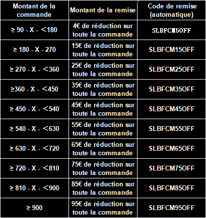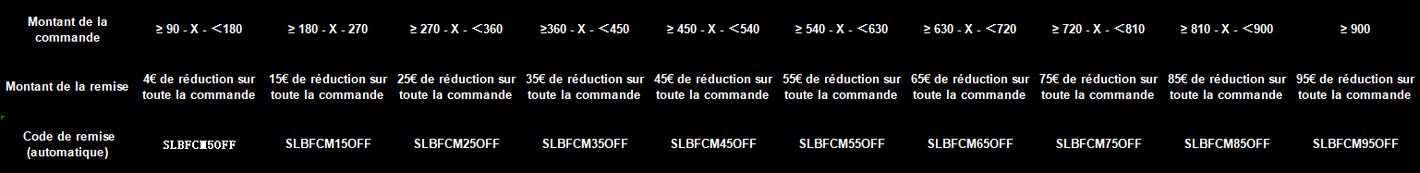 (1) Réduction sur toute la boutique : lorsque le montant total des produits éligibles de votre commande (à l'exception des filaments techniques et des produits électroniques) atteint le minimum requis pour bénéficier des réductions, celles-ci sont automatiquement appliquées lors du paiement. Remarque : les filaments techniques et les produits électroniques ne sont pas pris en compte dans le calcul du montant minimum de commande.