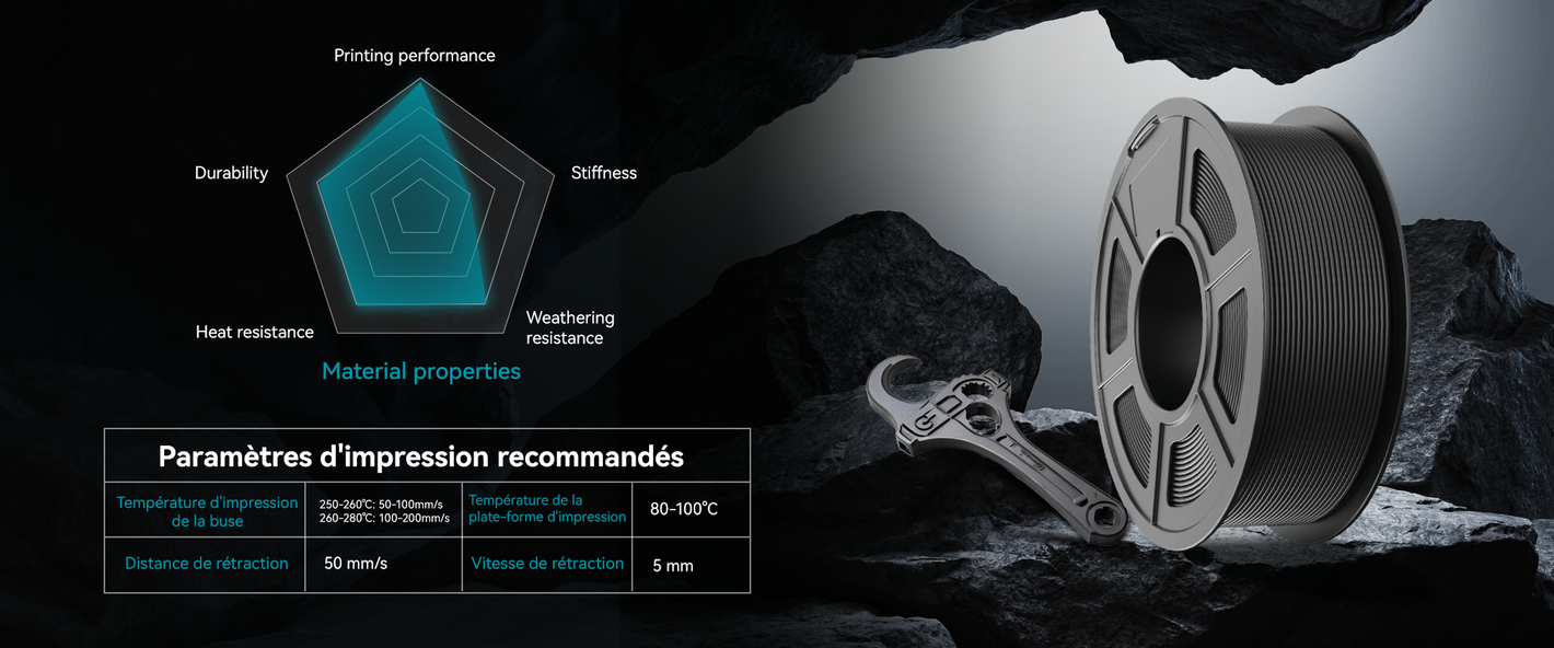 [Réglage d'impression recommandé] Température d'impression de la buse : 250-260℃, Température de la plateforme d'impression : 80-100℃, Vitesse d'impression : 40-60mm/s, Distance de rétraction : 5mm, Vitesse de rétraction : 50mm/s. Compatible avec la plupart des imprimantes 3D FDM qui peuvent utiliser un filament d'imprimante 3D de 1,75 mm.