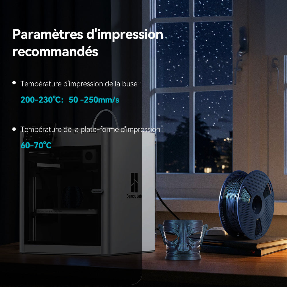S’inspirant de la beauté de la Voie lactée, le filament SUNLU PLA Galaxy combine un fond cosmique profond avec des effets d’éclats scintillants. Grâce à sa poudre nacrée ultrafine changeant de couleur (taille des particules <200µm), vos impressions 3D révéleront des variations de couleur dynamiques selon l’angle de la lumière. Le résultat est une finition étoilée éblouissante qui rend chaque création extraordinaire et véritablement unique.
